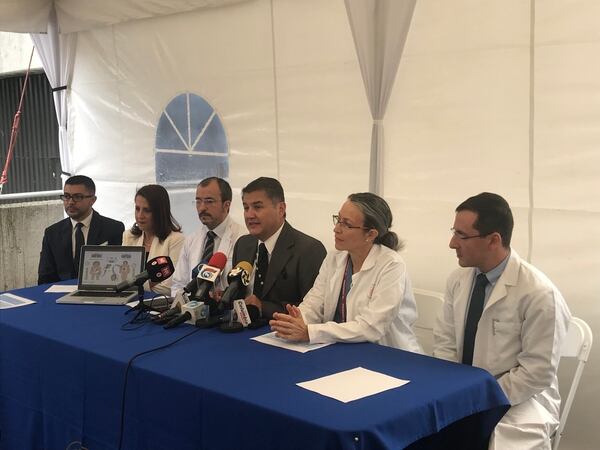 Autoridades hospitalarias y cirujanos hepatobiliares en la conferencia de prensa donde dieron a conocer el primer trasplante de hígado simultáneo donde dos pacientes reciben injertos de un mismo donante cadavérico.
