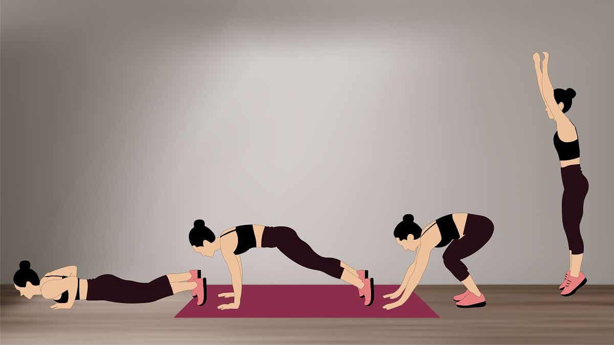 Los ‘burpees‘ consisten en ponerse de pie con los pies separados al ancho de las caderas. Desde aquí, se doblan las rodillas para hacer cuclillas e ir al suelo en posición cuadrúpeda. En ese momento se realiza una flexión de pecho y, con las manos, se empuja contra el suelo para ponerse de pie nuevamente.