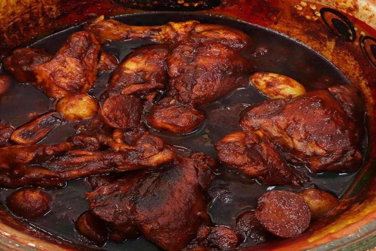 Agrega las piezas de pollo a la mezcla y déjalas cocinarse a fuego lento. Añade una o dos tazas de caldo cuando se reduzca y, de manera opcional, puedes agregar papines. La guarnición de este plato suele ser arroz blanco.