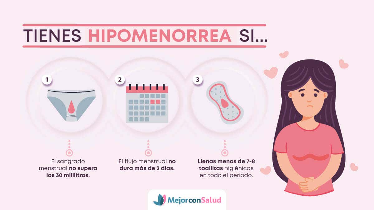 Un sangrado será considerado como hipomenorrea cuando no supere los 30 mililitros por ciclo. Otra característica podría ser una duración acortada de la regla, restringida a solo uno o dos días.
