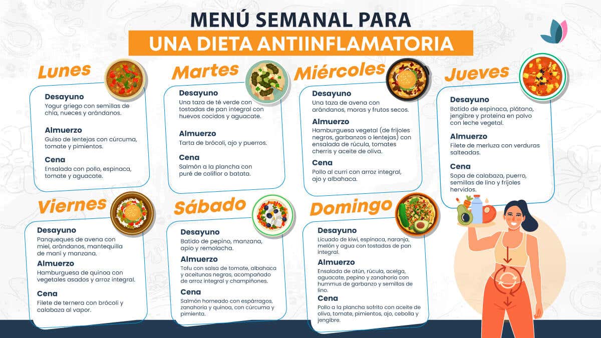 El siguiente es un ejemplo de una posible dieta antiinflamatoria. No es una propuesta fija, sino que puedes hacer combinaciones entre los distintos desayunos, almuerzos y cenas.